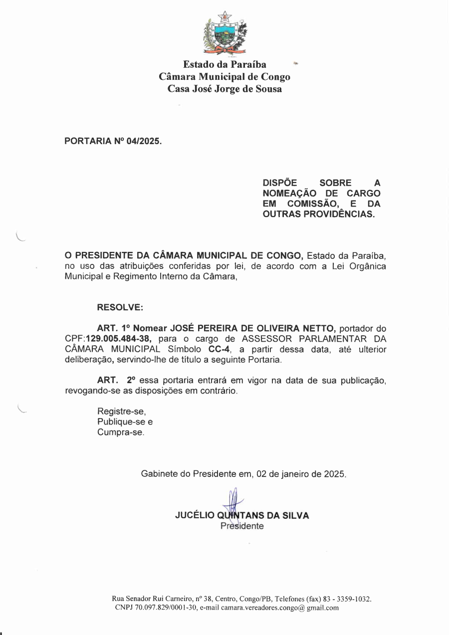 PORTARIA N° 0004/2025 – NOMEAÇÃO DE JOSÉ PEREIRA DE OLIVEIRA NETTO