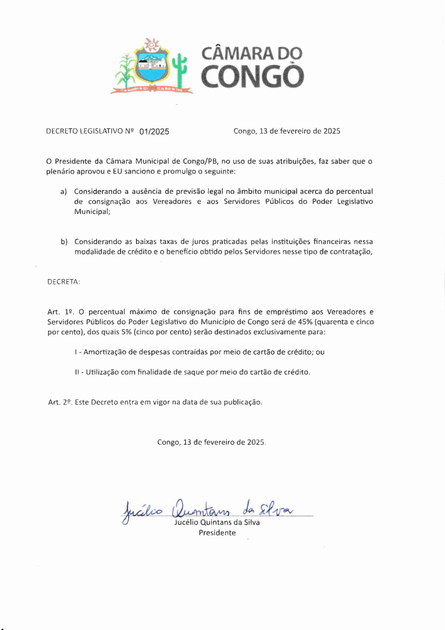 DECRETO N° 0001/2025 – DECRETA O PERCENTUAL MÁXIMO DE CONSIGNAÇÃO PARA FINS DE EMPRESTIMO AOS VEREADORES E SERVIDORES PÚBLICOS DO PODER LEGÍSLATIVO DO MUNICÍPIO