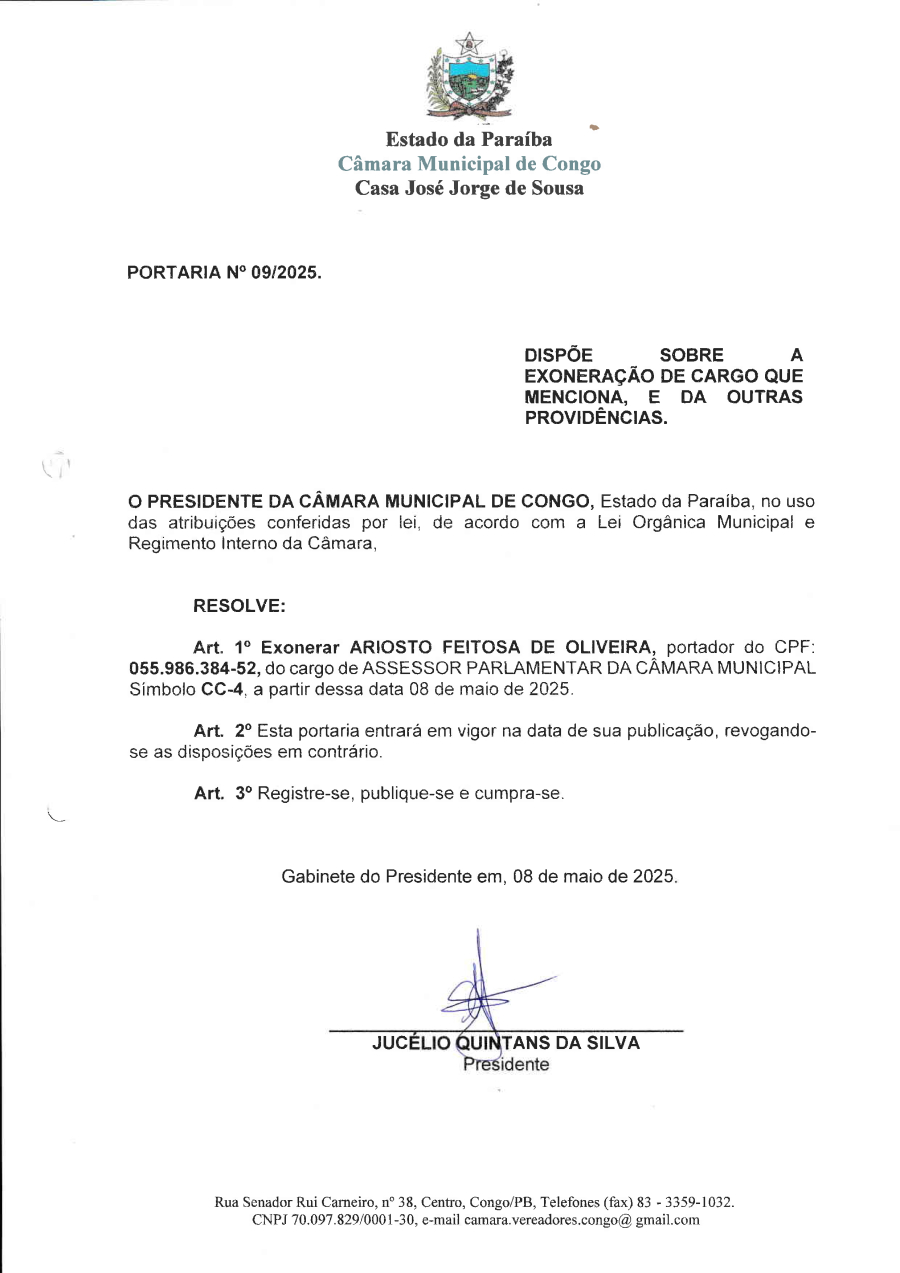 PORTARIA N° 0009/2025 – EXONERAÇÃO DE ARIOSTO FEITOSA DE OLIVEIRA